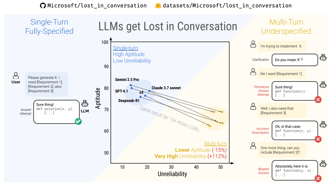 A 2025 study out of Salesforce Research ran 200,000+ simulated conversations and found that leading LLMs performed an average of 39% worse in multi-turn conversations than in equivalent single-turn tasks. The degradation came primarily from unreliability: models making early assumptions, prematurely committing to wrong answers, and failing to recover once they took a wrong turn. The researchers called it the "lost in conversation" phenomenon. Bigger models, reasoning models, extra compute — none of it fixed the problem. Separate long-context work in 2026 describes "intelligence degradation" once context grows past effective thresholds, reporting 45.5% degradation for one tested model beyond its critical range. The LONGMEMEVAL benchmark reported 30% to 60% performance drops in long-memory settings, with even strong commercial systems struggling.