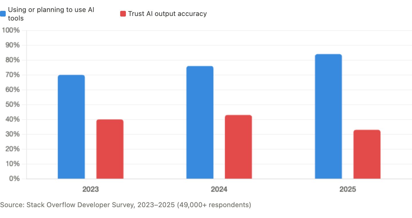 This is one of the more compelling B2B SaaS ideas in the AI reliability space right now, and the timing is unusually clean. According to LangChain's developer survey, the single biggest blocker to scaling agentic AI is unreliable performance, cited by 41% of respondents — ahead of cost, safety, and latency. The 2025 Stack Overflow Developer Survey found that 84% of developers now use AI tools, but only 33% trust the output. Trust is actually falling as usage rises. Companies are writing checks for reliability tooling. They just need a way to know what they are buying actually works past turn 20.