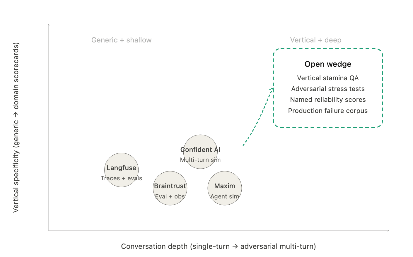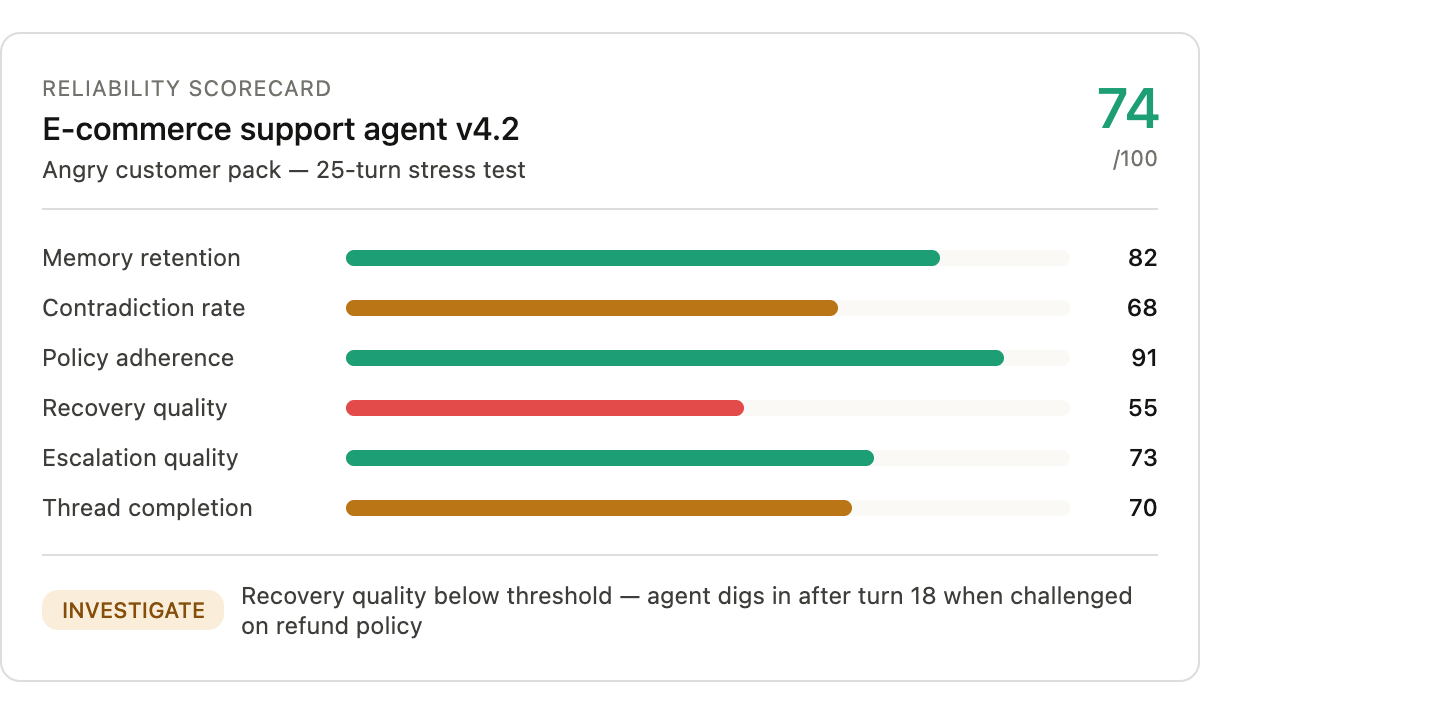All of these companies point at the same conclusion: agent reliability is becoming a real budget line. But they still mostly expose primitives — traces, datasets, generic metrics — rather than a strongly opinionated product that answers one question: at what point in a real conversation does this thing stop being trustworthy?
