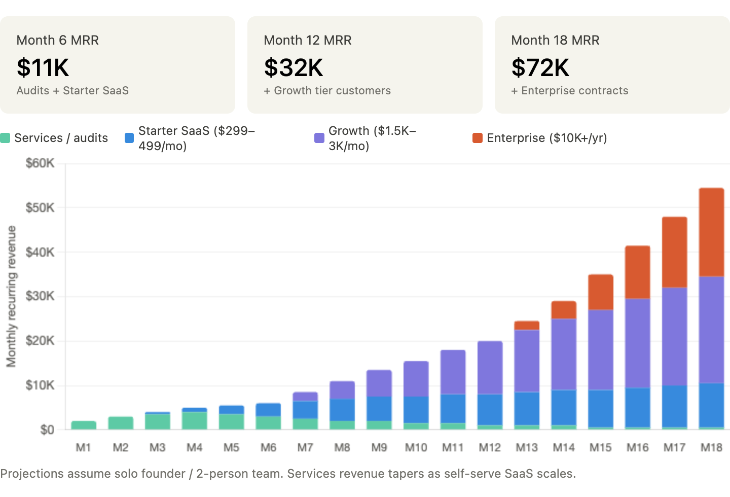 A solo founder or small team can reach $10–20K MRR within six months through productized audits and SaaS subscriptions, with a platform path to $100K+ MRR as vertical benchmarks and CI integration mature.