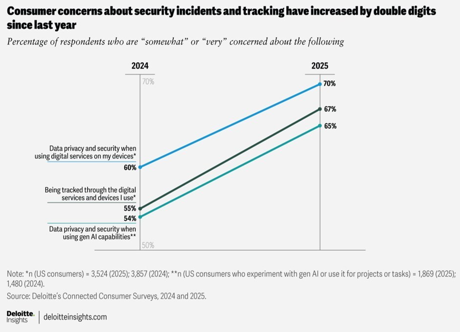 Deloitte's 2025 Connected Consumer Survey found that fewer than half of respondents (48%) now believe the benefits of online services outweigh their privacy concerns — the lowest since Deloitte began tracking in 2019, and a steep drop from 58% just the year prior. Nearly 6 in 10 worry about being tracked through their devices. Only about 1 in 10 say they're "very willing" to share sensitive data, even in exchange for better digital experiences.