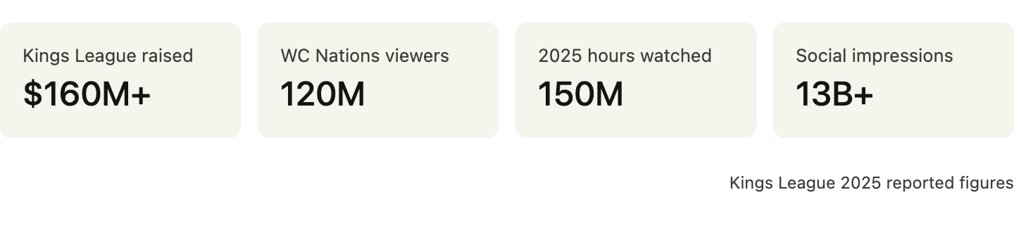 Creator leagues are entering the U.S. simultaneously. Kings League, founded by Gerard Piqué in 2022, now runs seven men's competitions and two Queens League women's competitions across multiple continents. Its January 2026 World Cup Nations tournament in São Paulo drew over 120 million cumulative livestream viewers across 40 games, with 41,316 fans in the arena for the final. Sponsors include Adidas, Netflix, Spotify, and Visa. A U.S. launch is in motion with a managing director staffed in New York.
