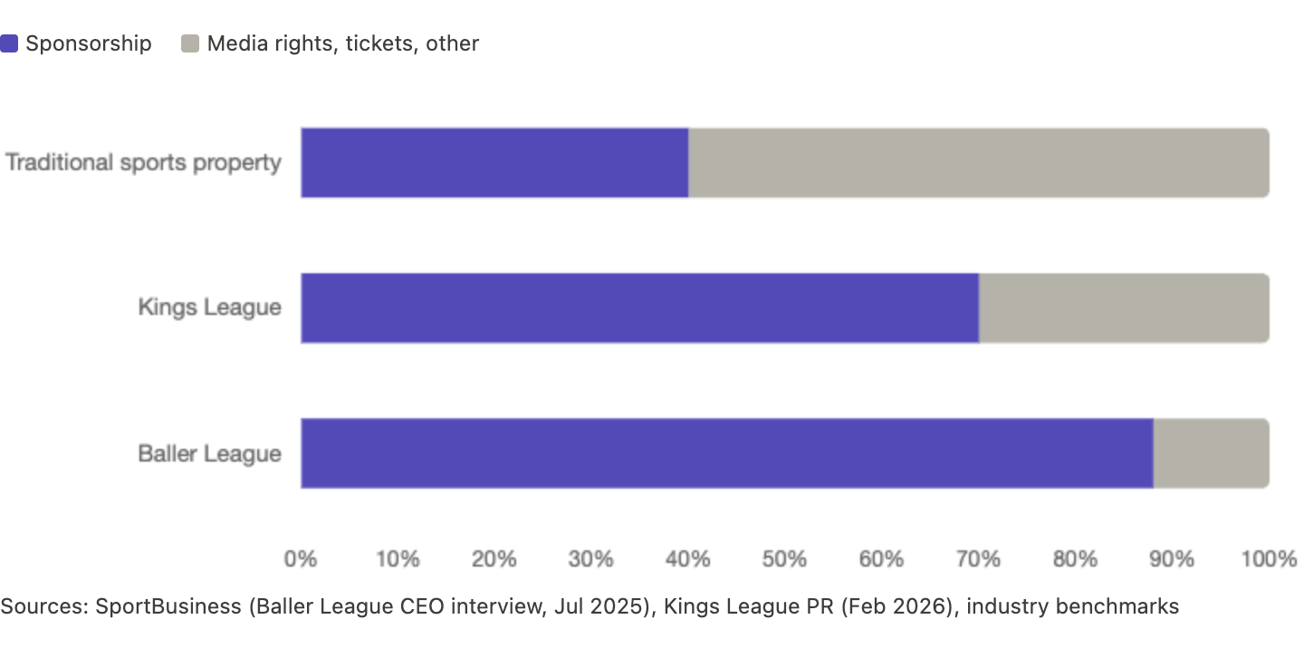 Baller League's CEO told SportBusiness that 85–90% of their revenue comes from sponsorship, far above the typical 40% for sports properties. In Germany, a single shirt sponsorship deal was worth €3 million per season. They deliberately keep streams free and tickets affordable to maximize audience scale and make the sponsorship pitch irresistible.