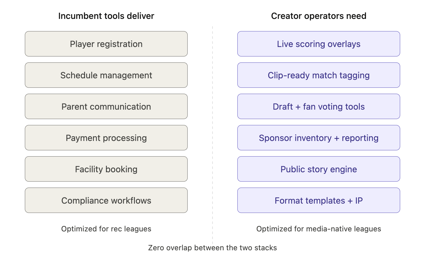 A standard rec-league SaaS sells into administrators, competes on feature checklists, and gets stuck doing low-emotion operational work. The creator-sports platform owns a fundamentally different layer: the game format itself, the clip pipeline, the fan interaction primitives, and eventually the sponsor marketplace.