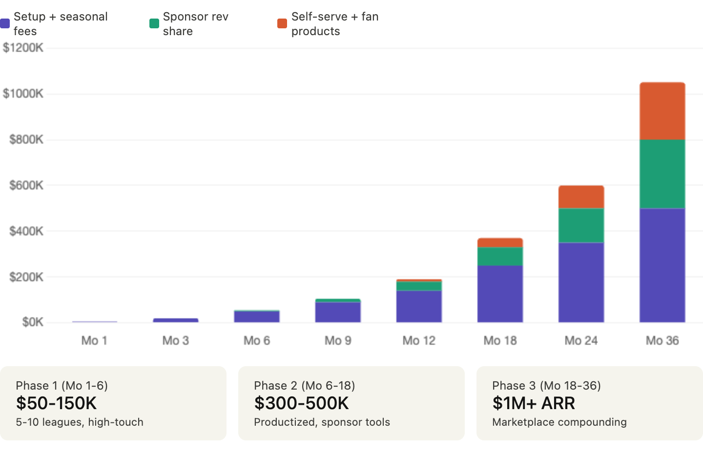 Soccer and futsal are the wedge. The real category is creator-run competitive formats. Revenue path: $50K–$150K in the first six months from high-touch launch packages, scaling past $1M ARR within 18–24 months as the sponsor marketplace compounds.