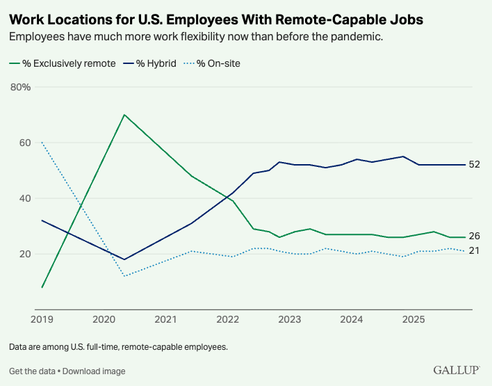 Gallup's Q2 2025 data is definitive: 52% of remote-capable U.S. employees work hybrid, 27% are fully remote, and only 21% are fully on-site. That breakdown has held steady since late 2022. 88% of U.S. employers now offer at least some flexible arrangement. Even with high-profile RTO mandates from Amazon, JPMorgan, and the federal government, hybrid job postings grew from 15% to 24% between 2023 and mid-2025. Fully on-site listings dropped from 83% to 66% in the same period. Both employees and managers prefer the flexibility β this isn't a transitional phase.