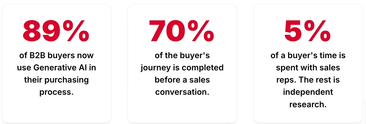 Every B2B buyer now starts with the same move: they ask an AI. Forrester's data shows 89% of B2B buyers already use generative AI as a self-guided research source across their entire purchasing process. By 2025, it became the single most cited "meaningful interaction type" for evaluating vendors. The models favor authentic customer evidence — reviews, outcomes, community experiences — over polished vendor copy. If your wins aren't structured for machines to read, you don't exist at the moment the shortlist gets made.