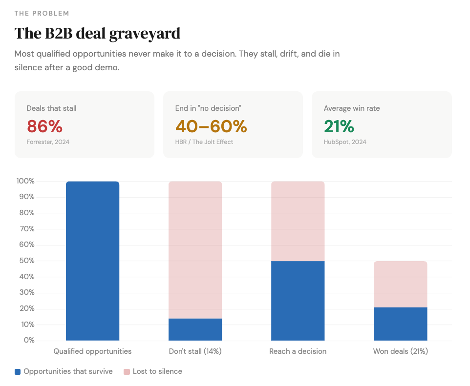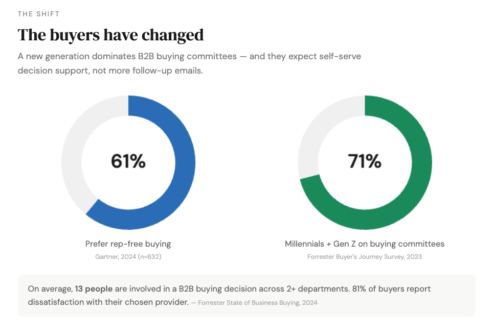 Around 61% of B2B buyers now prefer a rep-free buying experience — a number that climbs higher among millennials and Gen Z, who together make up 71% of B2B buying committees. Meanwhile, 40% to 60% of B2B deals end in "no decision" according to a Harvard Business Review study of 2.5 million sales conversations, and Forrester reports that 86% of B2B purchases stall at some point during the buying process. These deals aren't lost to a competitor. They're lost to silence — to a PDF that couldn't carry the conversation forward when the rep wasn't in the room.