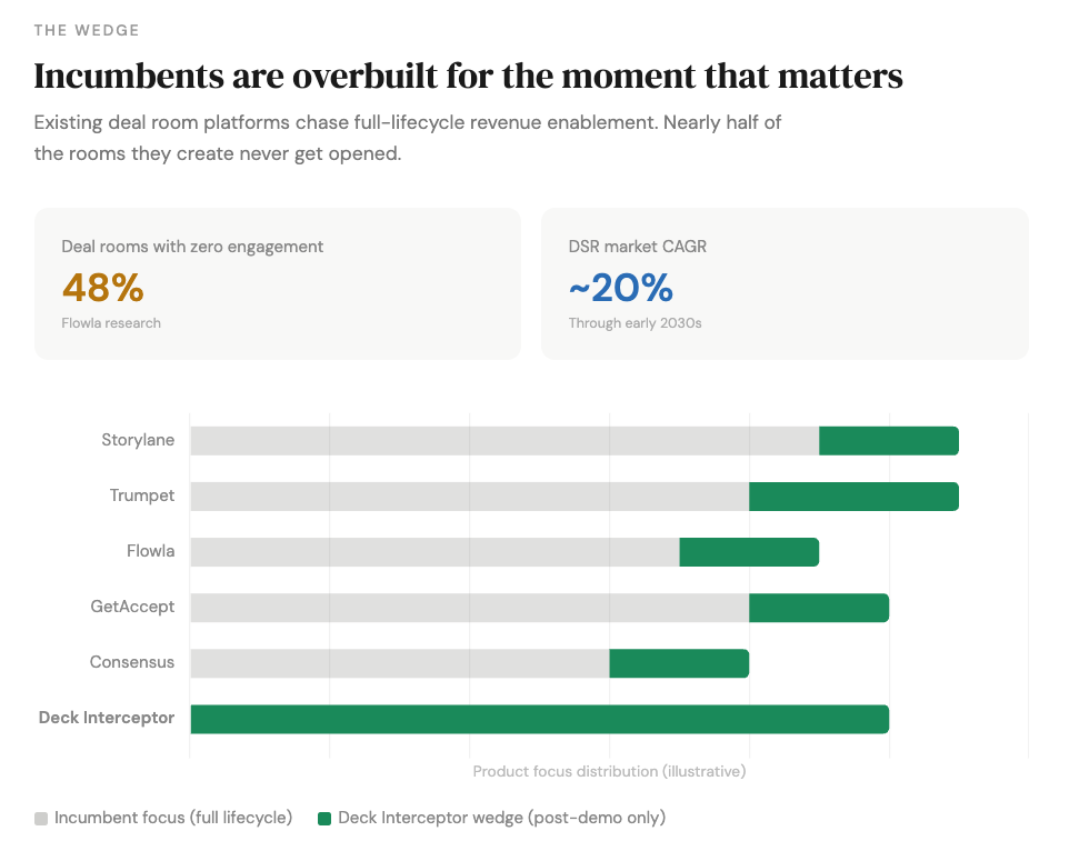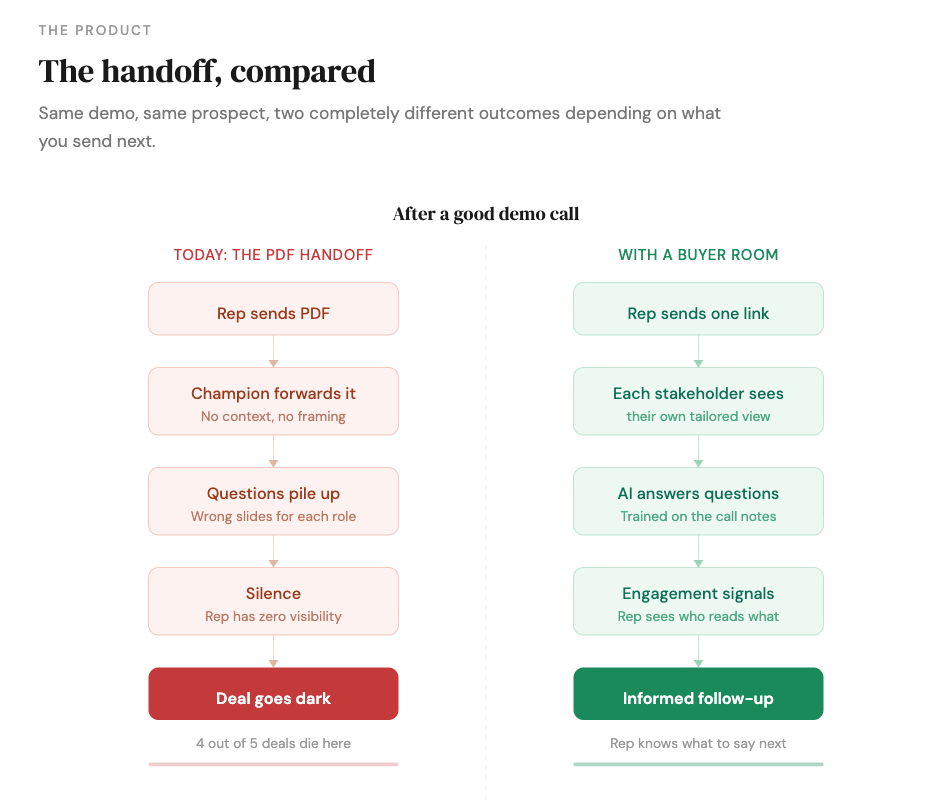 That failure rate points to the wedge. Existing tools try to be everything: document hosting, proposals, mutual action plans, contracts, onboarding flows, room collaboration, templates, coaching dashboards. They optimize for the full revenue lifecycle. That ambition is exactly what makes them heavy. And heaviness kills adoption at the one moment that matters most — the five minutes after a demo when a rep decides what to send.