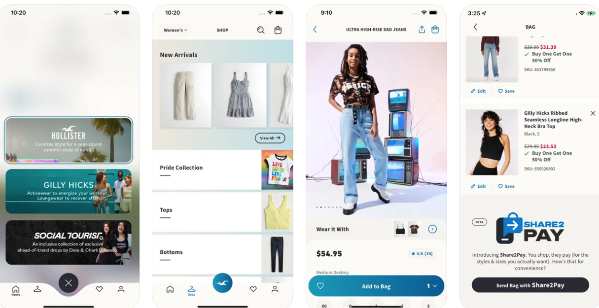 Abercrombie/Hollister rolled out Share2Pay in 2022: shoppers can build a cart and share it with someone else to complete the purchase. Through internal research, Hollister found that teen shopping bags often sat idle until the shopper was in the same physical space as the payer—usually a parent or grandparent.