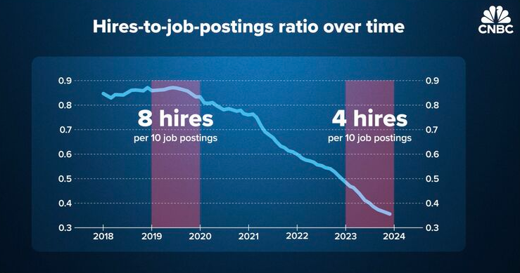 In 2019, employers made 8 hires for every 10 job postings. By 2024, that number collapsed to 4 hires per 10 postings. The listings doubled. The hiring didn't.