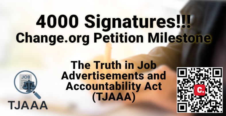 The proposed Truth in Job Advertising and Accountability Act (TJAAA) at the federal level would require employers to disclose salary ranges, intent to hire, funding status, and reposting history—with a 90-day maximum posting window. The TJAAA Working Group has gathered 3,000+ signatures and earned Forbes and CNBC coverage.