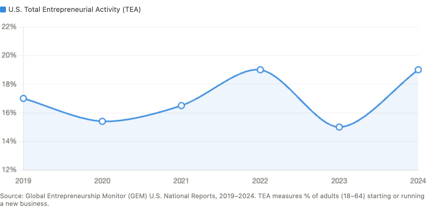 Babson College's GEM 2024β2025 U.S. report shows Total Entrepreneurial Activity at a historic high of 19%. The highest rates were among 18β24 and 25β34 year-olds, both at 25% TEA. Junior Achievement found 76% of teens aged 13β17 would likely consider entrepreneurship, and 60% said they'd prefer starting a business over a traditional job. A Samsung/Morning Consult survey of U.S. students aged 16β25 found half wished to start a business. One in five Gen Z and Millennial founders say they were students before starting their companies, compared to just 3% of Gen X and Boomer founders.