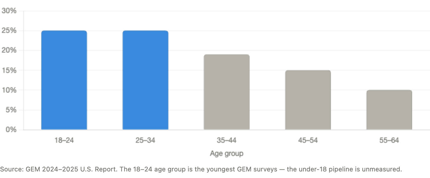 GEM only surveys adults 18 and older. The pipeline feeding those statistics starts younger. Between AI coding tools, vibe coding, no-code platforms, and creator monetization, the minimum viable age for building something that looks like a real business drops every quarter. Teenagers are shipping micro SaaS products, running agencies, selling digital templates, and monetizing audiences β often before they can legally sign for a bank account. The supply of young builders keeps rising. The legal and financial stack serving them is still patchy and built entirely on adult assumptions.