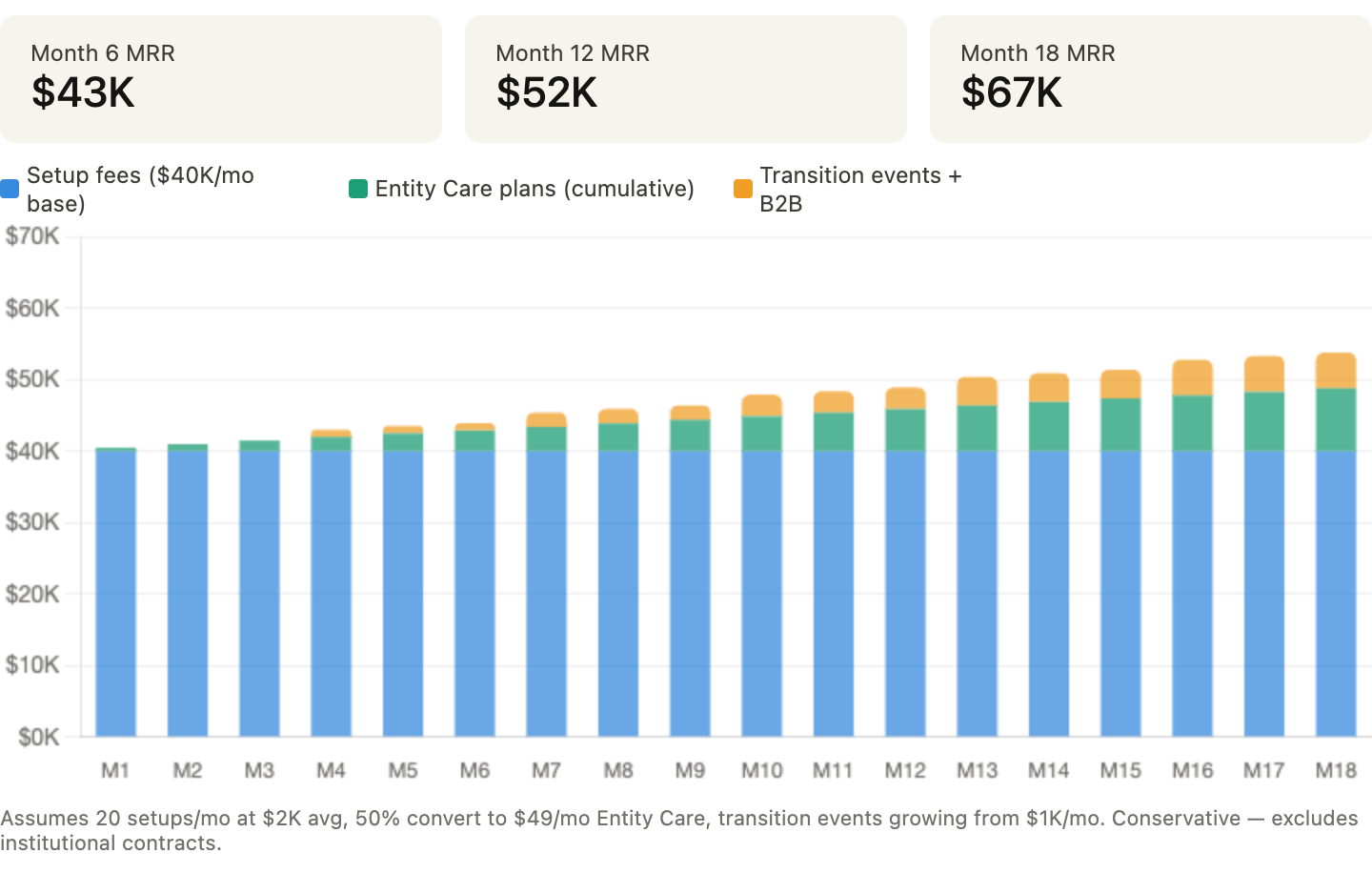 Setup fees of $1,500β$3,000 per founder, recurring compliance plans, and institutional contracts create a path to $50Kβ$100K+ MRR within 18β24 months, bootstrapped.