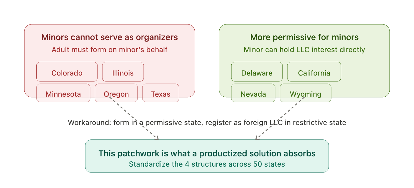 The heist is turning repeatable legal judgment into productized rails. You standardize the common structures lawyers already use β guardian-managed LLCs, custodial arrangements, trust-based ownership wrappers, age-up transitions at 18, bank/KYC handoffs, contract-signing permissions β and expose them through software. Once you do that, your customers stop being just families. They become accelerators, student founder programs, youth creator platforms, and fintechs that need a safe way to support minors without hand-reviewing edge cases every time.