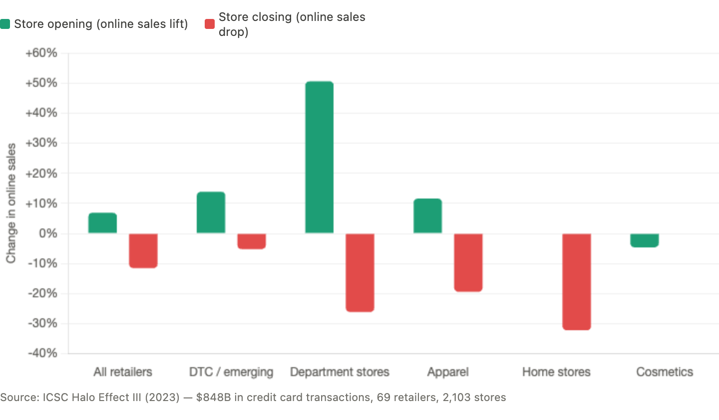 This isn't anecdotal. ICSC's Halo Effect III study analyzed $848 billion in credit card transactions across 69 retailers and 2,103 stores. Opening a physical store lifts online sales in the surrounding area by 6.9%. For DTC brands, 13.9%. Close that same store and online sales drop 11.5%. Department stores that shutter a location see total spending collapse by nearly 49%.