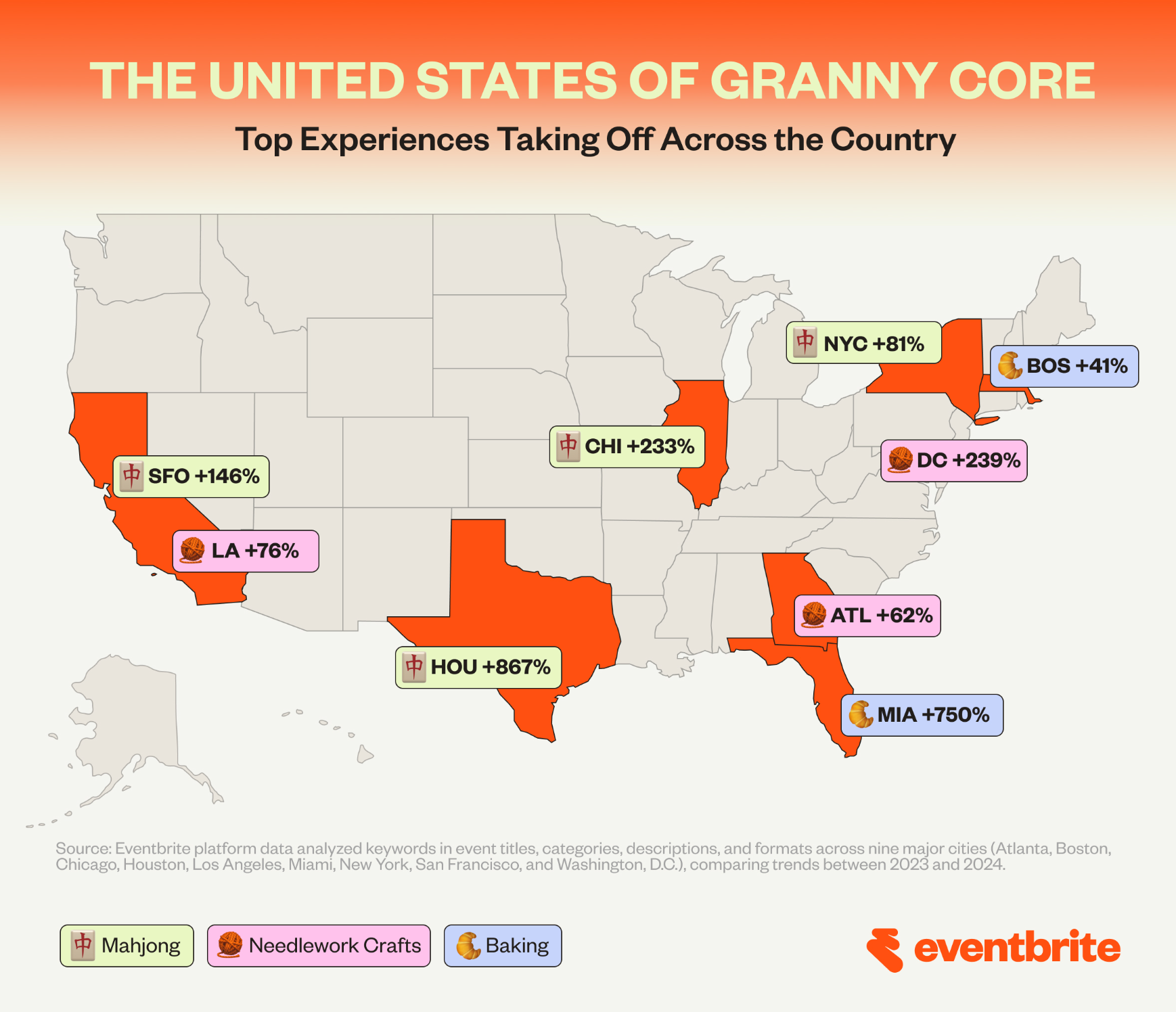 Eventbrite tracked 179% growth in U.S. mahjong event listings between 2023 and 2024. The platform explicitly called out mahjong as part of the "granny-core" wave—nostalgic offline hobbies surging among younger crowds looking for structured connection.