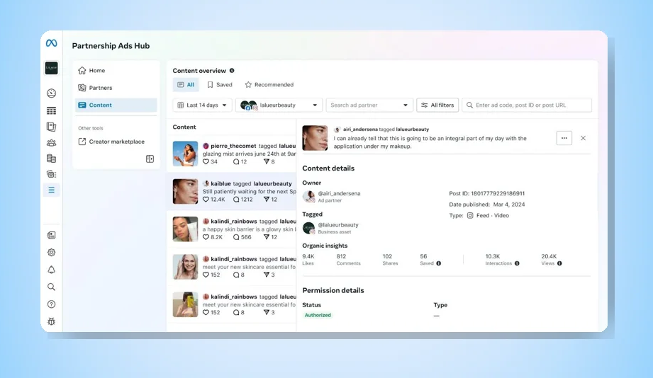 - Discovery expansion: Instagram UGC and affiliate posts now surface in Partnership Ads Hub alongside branded content