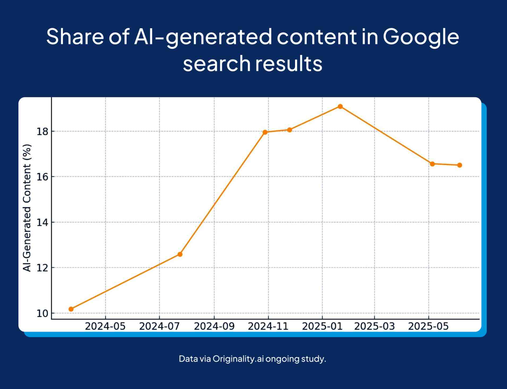 Google saw it coming. Their March 2024 core and spam updates explicitly targeted "scaled content abuse" and expired domain manipulation, aiming to cut low-quality content by roughly 45%. By early 2025, AI-generated content still represented 17-19% of top search results according to Originality.ai's live tracking. The slop bounced back faster than Google could patch it.