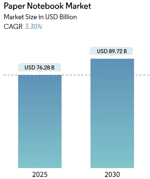 The global paper notebook market sits at roughly $25–27 billion in 2025, with hardcover and premium segments growing at 4–5% annually through 2030. Multiple industry reports confirm steady expansion even as digital alternatives multiply.