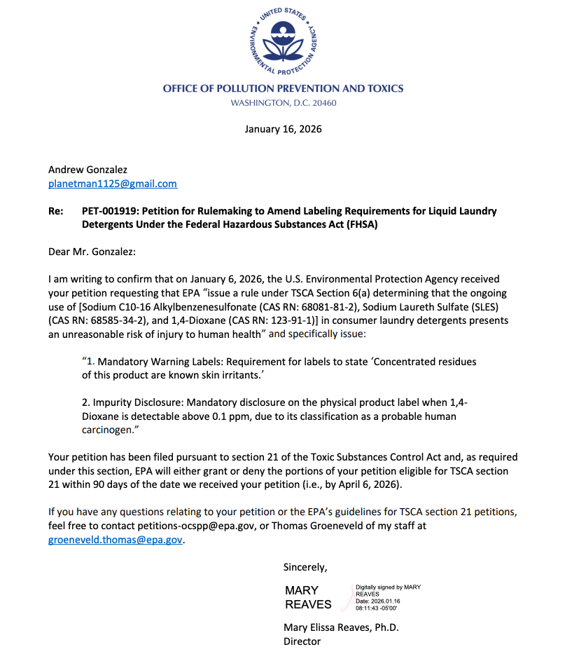 A TSCA petition just forced EPA to evaluate chemical residue left on clothes by HE washers. No consumer scoring tool covers laundry residue โ a micro SaaS startup idea hiding inside a regulatory gap worth building now.