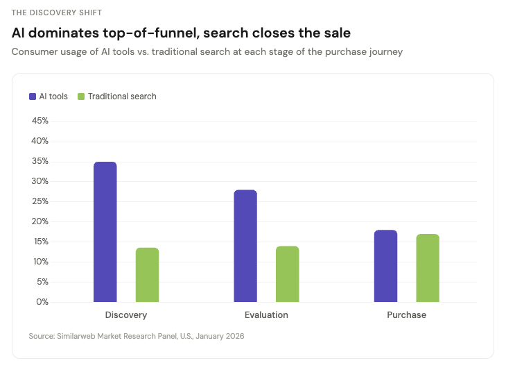 The sharper data came in March 2026. Similarweb's GenAI Brand Visibility Index found that 35% of U.S. consumers now use AI tools at the product discovery stage, versus just 13.6% who use traditional search. At evaluation, AI holds a 2:1 advantage. The gap only closes at the final purchase step.