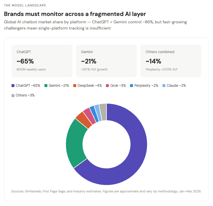 The first layer is still Google: links, clicks, rankings, intent capture. The second layer is the model layer. ChatGPT, Gemini, Claude, Perplexity, and AI Overviews now decide which brands enter the conversation before a user ever sees a link. Gartner predicted traditional search volume would drop 25% by 2026 as AI chatbots absorbed discovery behavior. That prediction is landing.