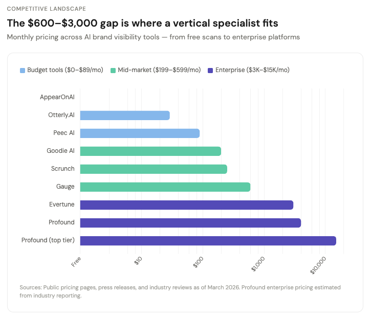 Mid-market tools are multiplying. Scrunch ($250/month), Goodie AI ($199/month), and Gauge ($99β$599/month) serve growing marketing departments with different angles: discovery path mapping, e-commerce focus, and competitive intelligence, respectively.
