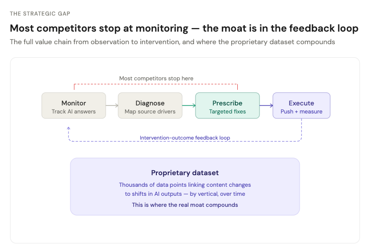 The intervention-outcome dataset. Every tool can call an API and store outputs. There is no moat in that. The moat is in collecting thousands of data points linking specific content interventions to changes in AI outputs across models, over time, within a vertical. If you know that updating a specific comparison page improved Brand X's Share of Model score by 14% over six weeks in the supplements category, that knowledge compounds. After a year of that data, you have a proprietary causal map that no competitor can replicate without doing the same work.