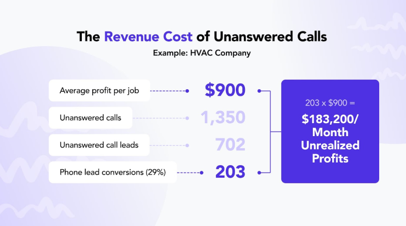 Home service businesses miss approximately 27% of their inbound calls. Around 85% of unanswered callers never try again — they call a competitor. Each missed call can represent $300–$1,200 in immediate lost revenue and $5,000–$15,000 in lifetime customer value. The average small business forfeits over $126,000 annually to calls that go unanswered.