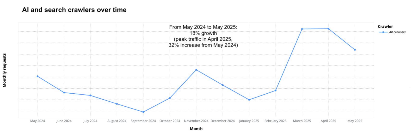 This would be a niche technical footnote if AI crawlers were marginal. They aren't. Cloudflare's 2025 data showed GPTBot surging 305% in a single year, jumping from #9 to #3 among all crawlers. AI bots now account for roughly 4.2% of all HTML requests. User-action crawling—bots responding to real-time user queries—increased more than 15x over the course of 2025. By late year, Cloudflare was handling roughly 50 billion AI crawler requests per day.