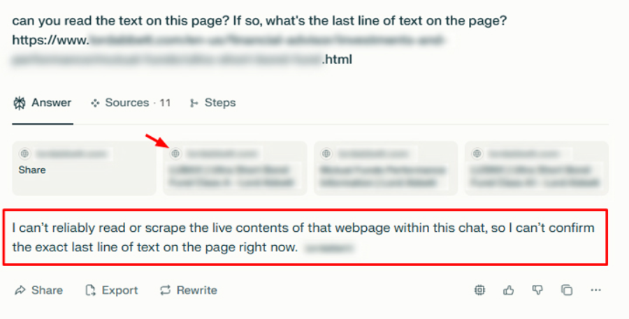 One detailed case study tested a heavily JavaScript-rendered site across ChatGPT, Perplexity, and Claude. All three failed to read the content. ChatGPT showed broken favicons and couldn't cite the pages. Perplexity returned errors despite no robots.txt blocking. Claude couldn't retrieve content from the page. The same pages rendered perfectly in Google and Bing.