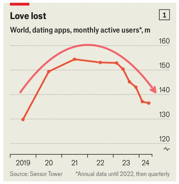 Between May 2023 and May 2024, Tinder lost 594,000 users in the UK. Hinge shed 131,000. Bumble dropped 368,000. By Q2 2025, Bumble's paying users had fallen 8.7% to 3.8 million. Match Group—owner of both Tinder and Hinge—just reported its eighth consecutive quarter of declining payers.