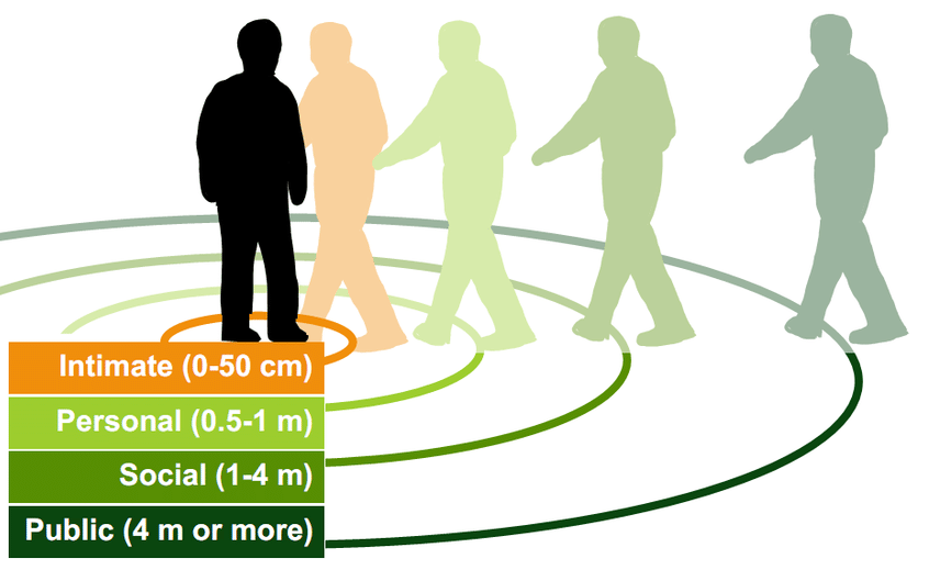 In the 1960s, anthropologist Edward T. Hall coined the term Proxemics—the study of personal space as a form of nonverbal communication. He discovered that every human walks around inside four invisible, concentric bubbles: