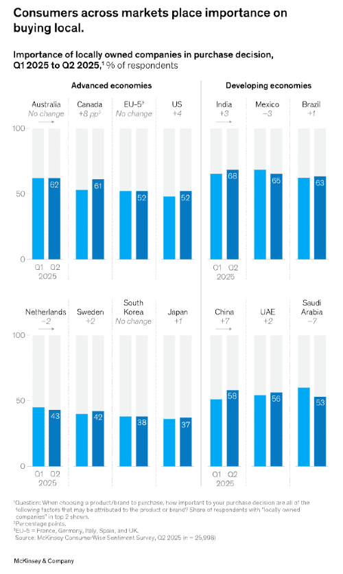 Local preference is rising—and becoming identity. McKinsey's consumer research shows this isn't pandemic nostalgia. Tariff volatility, supply chain anxiety, and cultural backlash against faceless globalization are making "local" a signal of values. In China, six of the top ten beauty brands gaining share since 2020 are domestic. In Japan, nine of the top ten snack brands are Japanese. American consumers are following.