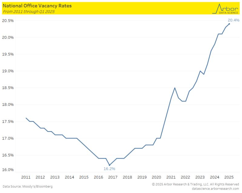 Meanwhile, commercial real estate is quietly bleeding. Office vacancy rates nationally sit around 19%—the highest in recent history. In key downtown markets, vacancy pushes into the mid-20s. Landlords are losing money on empty space during off-peak hours.