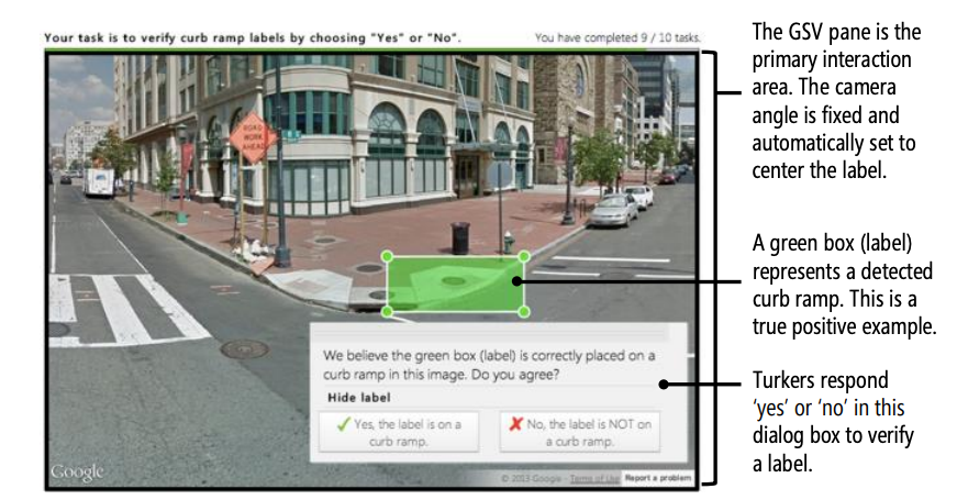 Human-verified (ground truth): curb cut present/missing, obstruction frequency (construction, parked cars, trash bins, utility poles), surface issues (cracks, steep grade, uplift), timestamped "cannot pass" flags.