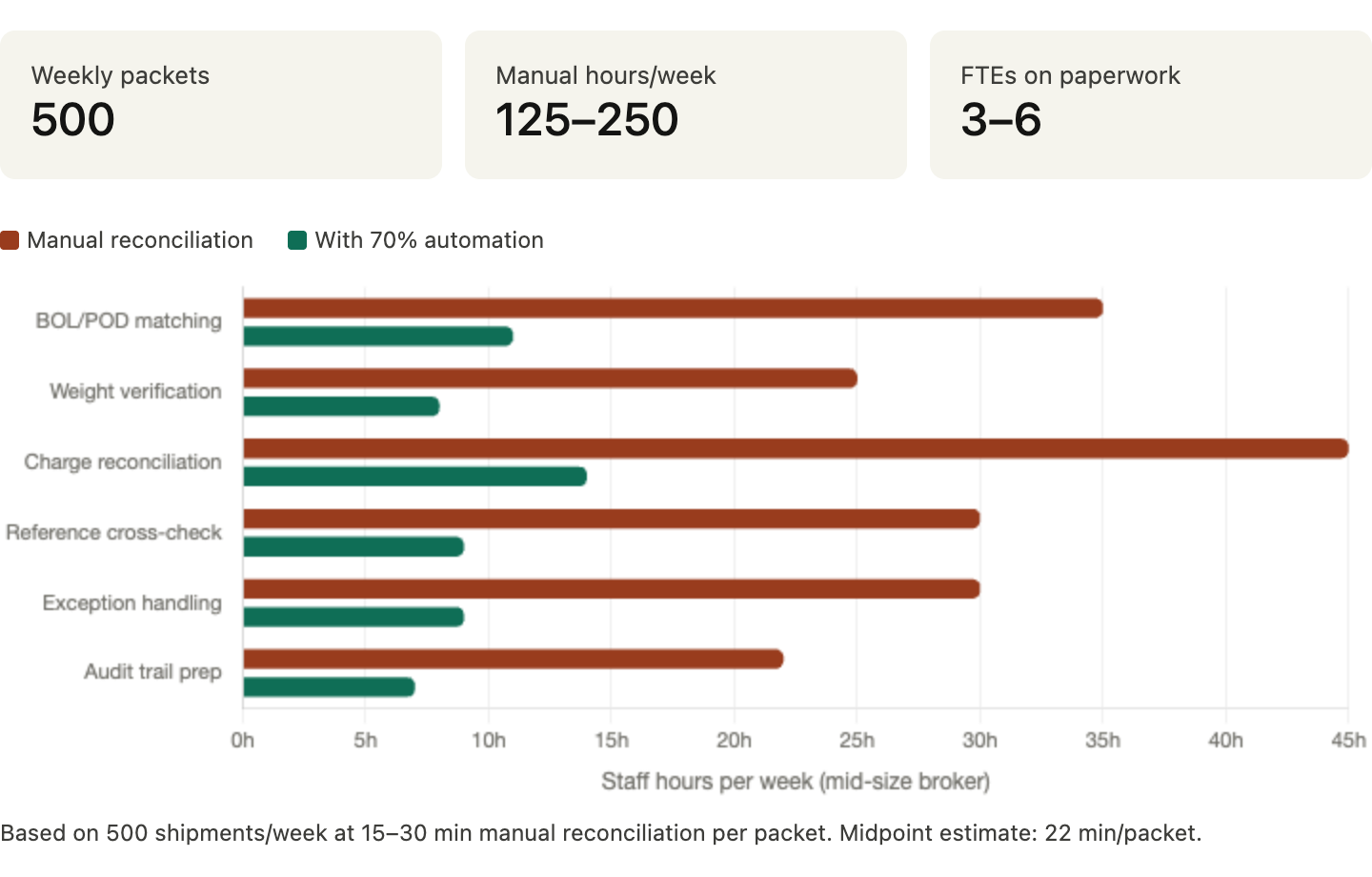 A concrete example: A mid-size freight broker processes 500 shipments per week. Each packet requires 15–30 minutes of manual reconciliation. That's 125–250 hours of staff time weekly — roughly three to six full-time employees doing nothing but checking paperwork. A product that cuts that by 70% pays for itself inside 30 days.