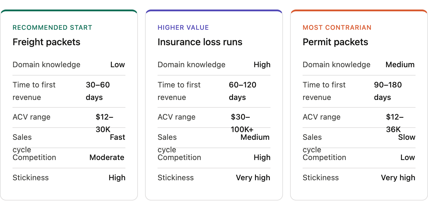 The best opportunities share a few traits: high-frequency document classes, real pain, semi-standardized formats, and downstream money that only moves after the document is trusted. Three wedges stand out.