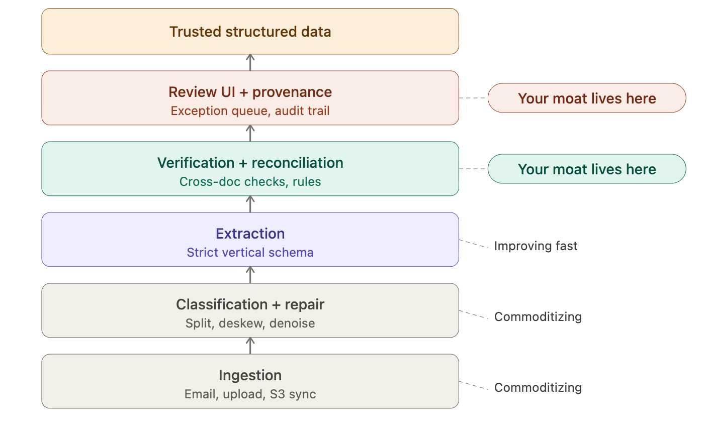 That moves you from "tool" to "control point." Reading gets cheaper every year. Verifying, reconciling, and routing correctly inside a messy workflow is still scarce — and that's where margins and stickiness live.