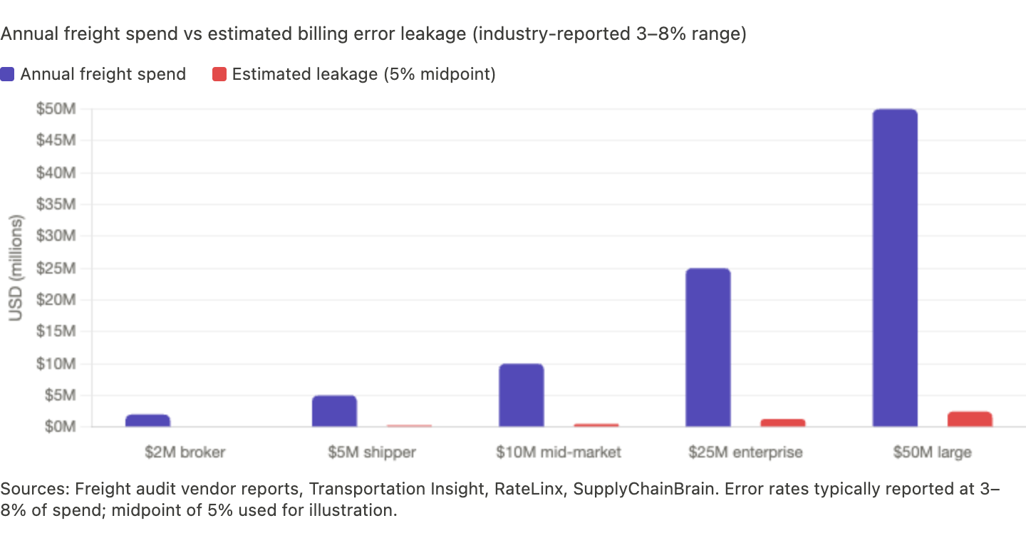 The stakes are concrete. Freight audit vendors and industry specialists consistently report that billing errors — wrong fuel surcharges, phantom accessorial charges, weight disputes, duplicate invoices — drain several percent of a company's total transportation budget. Estimates typically land in the 3–8% range, and the freight audit and payment market itself is growing at a high-single to low-double-digit CAGR as shippers scramble for cost control. Each invoice contains dozens of line items with complex rate calculations, carriers use different formats and calculation methods, and manual verification at scale is practically impossible.