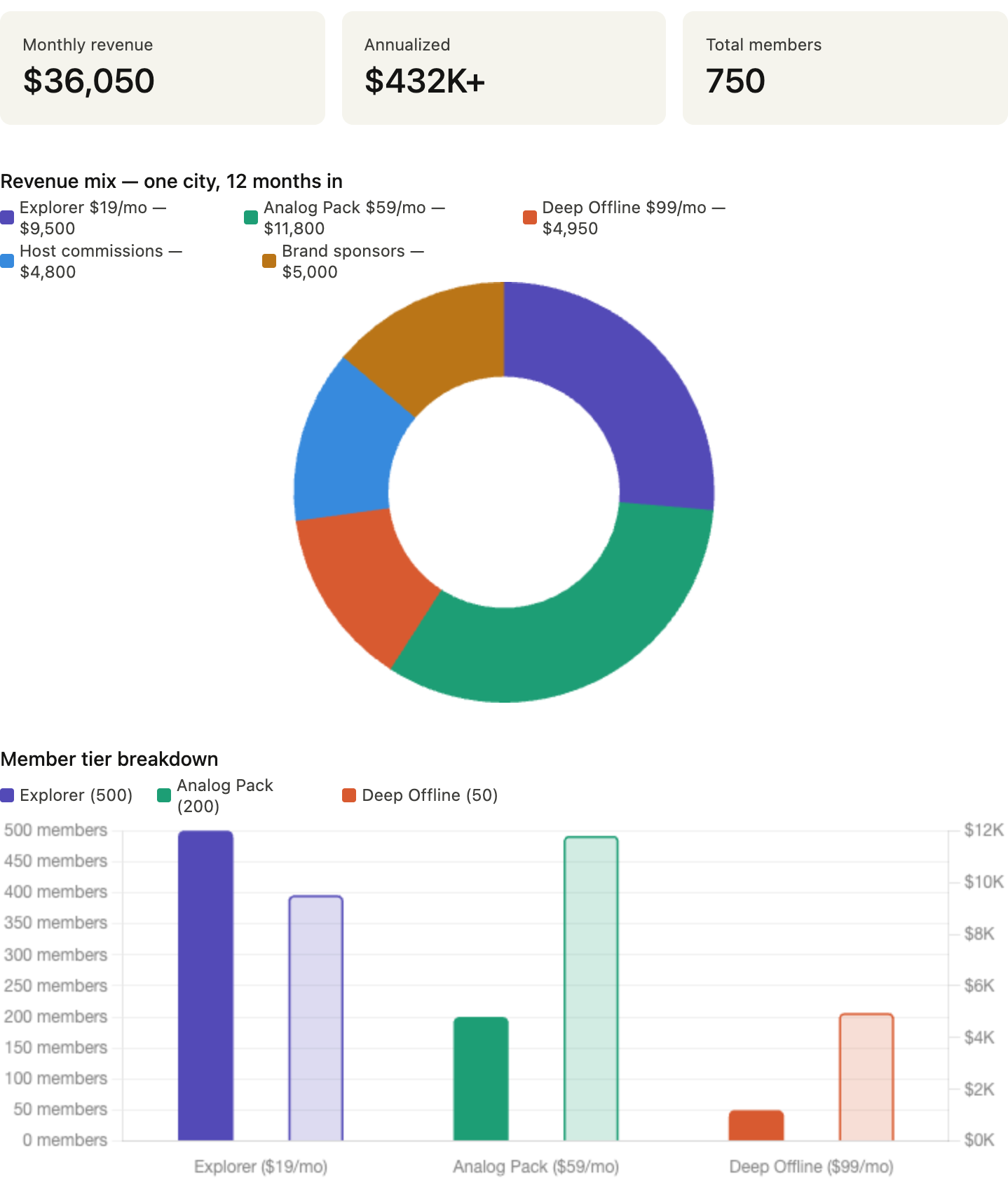 One city can generate $36K/month within 12 months. The bigger version becomes the operating system for analog wellness — a new product category sitting at the intersection of community business ideas, experience economy startups, and the $1B+ digital detox market.