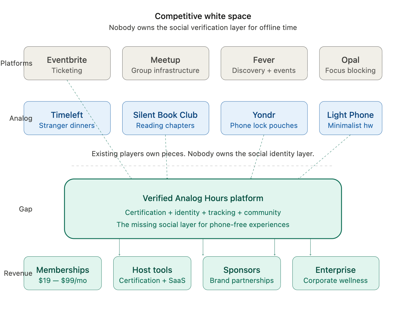 The strongest version of this company doesn't sell events. It sells a measurable unit of reclaimed attention — hours spent off the phone, in real space, with real people, verified through attendance and enforcement.