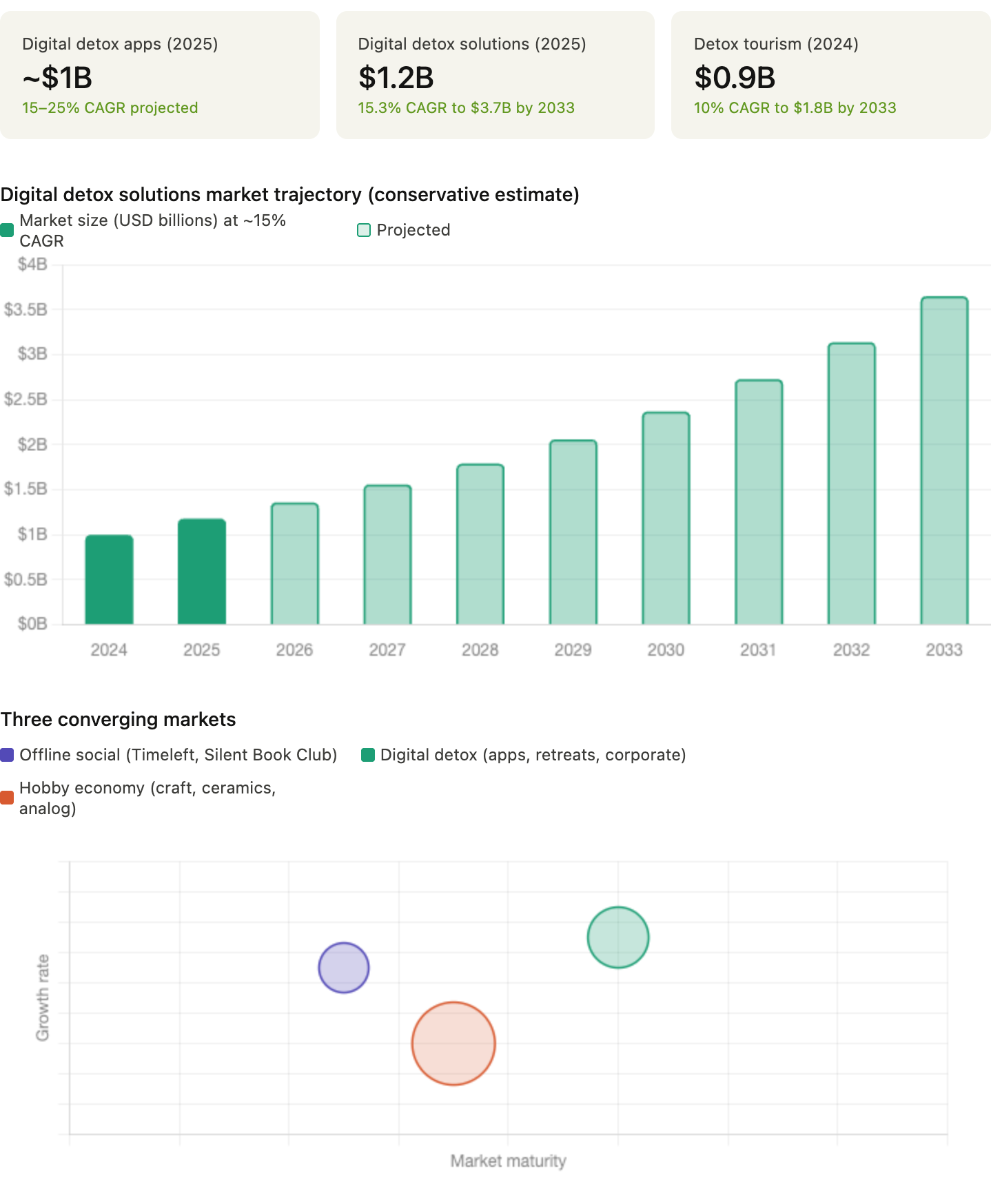 The Global Wellness Summit named "analog wellness" a defining 2025 trend, tying it to digital burnout and demand for tactile, presence-oriented experiences. Hospitality brands are building no-tech rooms and digital detox packages into core offerings. The broader digital detox solutions market is estimated at over $1 billion and projected to grow at 15–25% CAGR through the end of the decade.