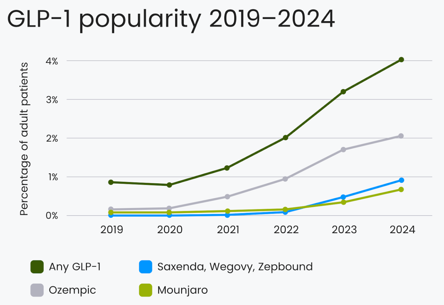 Adoption crossed the mass-market threshold. GLP-1 prescriptions for weight loss jumped 587% from 2019 to 2024. Among 18-39 year-olds, usage increased 588%. Major employers now cover GLP-1s (34% in 2024, up from 26% in 2023). Oral versions are coming, which will push adoption even higher.