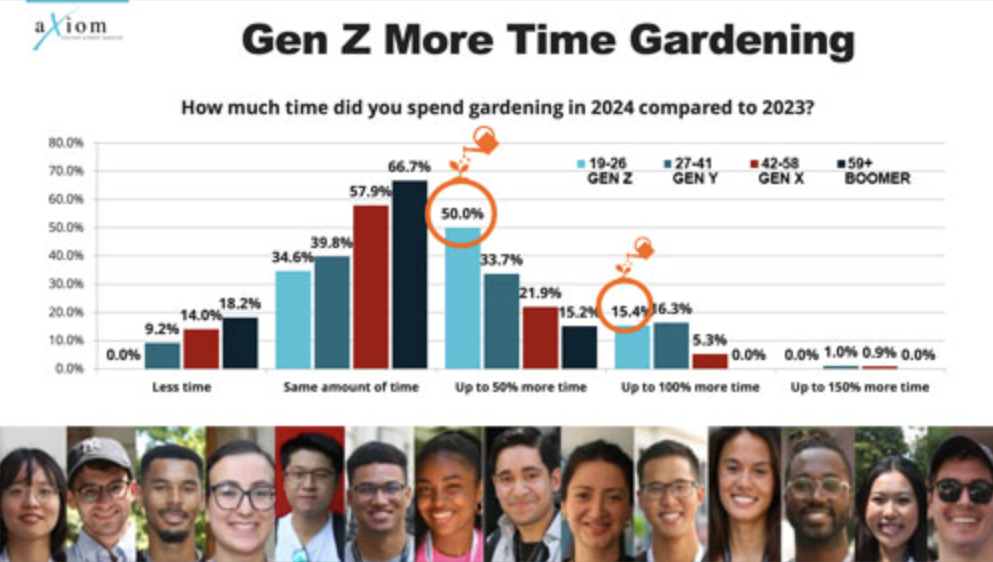 Generational spending. Axiom's 2026 Gardening Outlook Study found that 63.8% of Gen Z and 66.7% of millennials spent more time gardening in 2025 — roughly double the rate of Gen X. On budgets, 53.6% of Gen Z and 61.1% of millennials increased their gardening spend. A record 64% of all respondents plan to plant more and expand their gardens in 2026. This is the cohort most likely to buy identity-rich products online, document the process, and pay extra when a product feels like a lifestyle signal instead of a commodity.