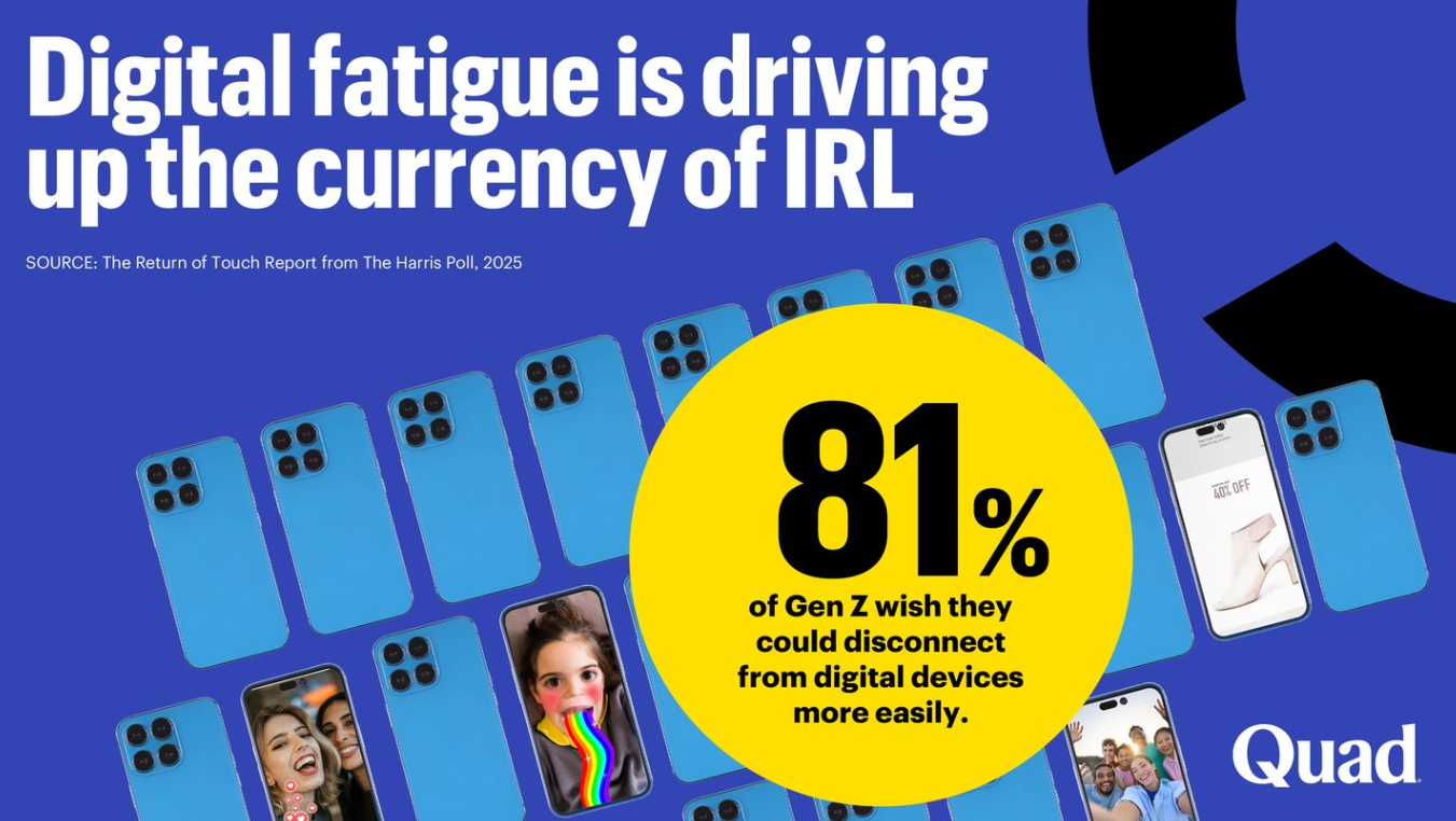"Slow social" is real consumer demand. A 2025 Harris Poll/Quad study found 81% of Gen Z say digital detoxes should be routine and that they wish it were easier to disconnect — and a large majority prefer brands that blend tech with more controlled, physical experiences. The industry is seeing a broad shift toward intentional, crafted, slower content, with strong predictions of a rise in creators who offer calm. This is a behavioral shift driven by content fatigue across demographics, not a niche aesthetic trend.