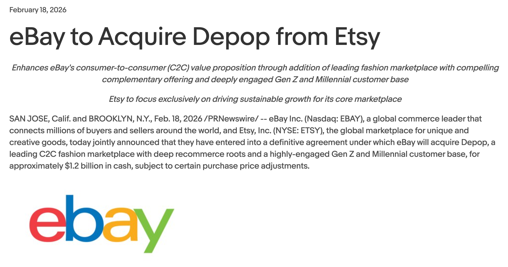 The momentum extends well beyond one platform. On February 18, 2026, eBay announced a $1.2 billion deal to acquire Depop, a marketplace with $1 billion in 2025 GMV, 60% year-over-year US growth, and seven million active buyers, nearly 90% under 34. ThredUp's 13th annual Resale Report projects global secondhand apparel will reach $367 billion by 2029 and US online resale will hit $40 billion, growing at 13% annually. The secondhand apparel market grew 14% in 2024, five times faster than retail clothing overall.