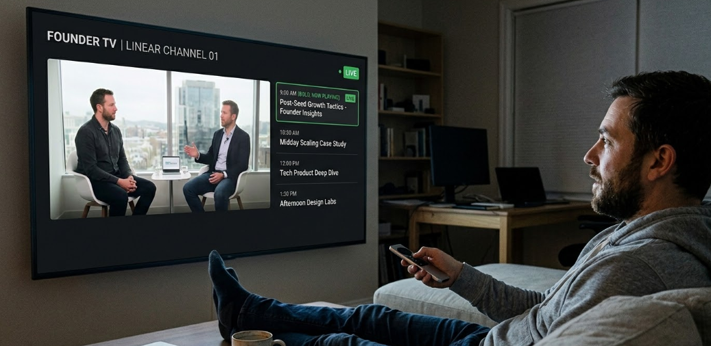 - Workday Founder TV — background business content from 8 a.m. to 6 p.m., programmed by energy arc. Morning strategy, midday interviews, afternoon deep dives.